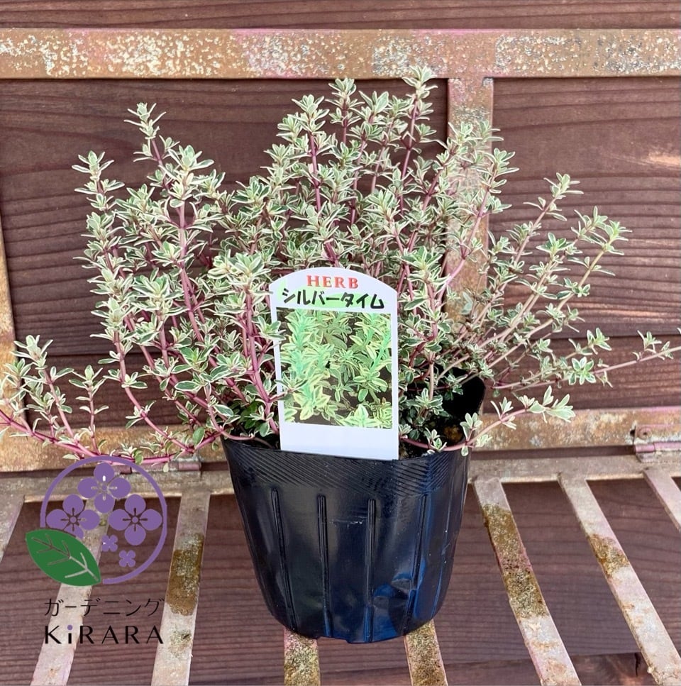 立性のタイム。シルバーリーフが美しいので寄せ植えなどに。茎はピンクがかっていて、葉の縁に白い斑が入ります。 秋から冬にかけて、全体がピンクと紫色をかけたように紅葉します。