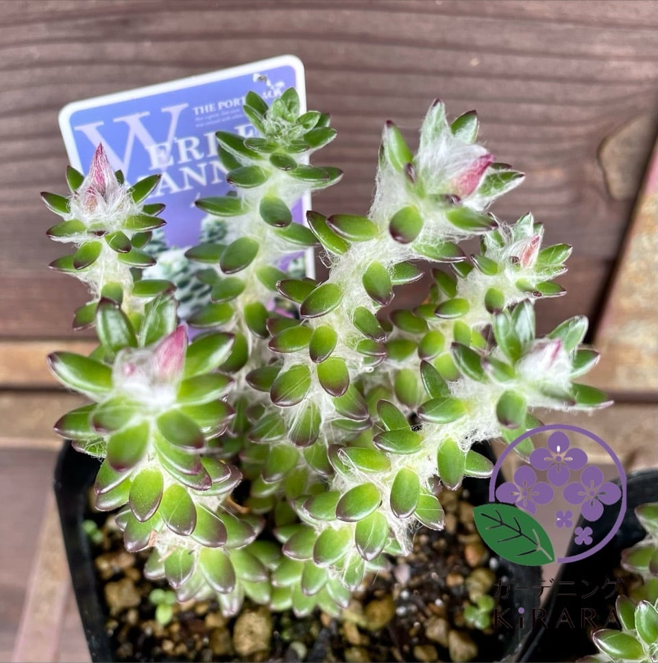 多肉植物の仲間で、緑の細めの茎が白い毛で覆われた姿がユニークなポーチュラカの仲間です。桃紫色の花がまさにポーチュラカの花姿です。耐寒温度5℃。